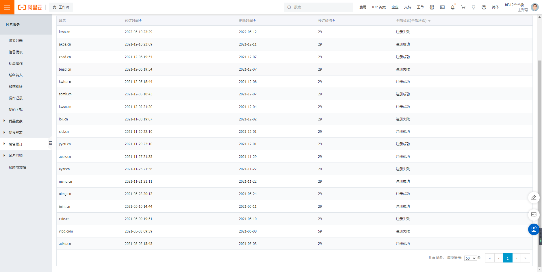 然而,今天就交了一次学费。前两天订的adko.cn居然出现在了我的域名列表中,下面18条记录中,注册成功的记录掰手指头都能数的清,adko.cn的右侧赫然写着注册成功!